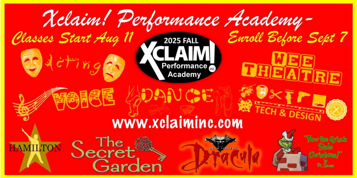 Xclaim! Performance Academy provides pre-professional experience and training to youth and adults in a variety of performance genres meant to provide skills for stage performers. Classes meet once per week for one hour each (WEE Theatre meets 45 minutes) for the entire semester - August 11 - November 22.