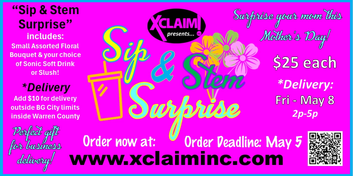 We will deliver a small assorted floral bouquet and your choice of Sonic soft drink or slush to your mother on Friday, May 8 from 2:00p-5:00p.